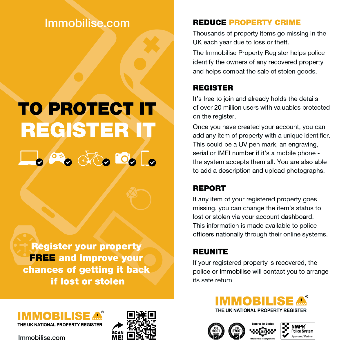- Mark items with your house number and postcode. Register on Immobilise for free, where the police can trace recovered items back to their owners.